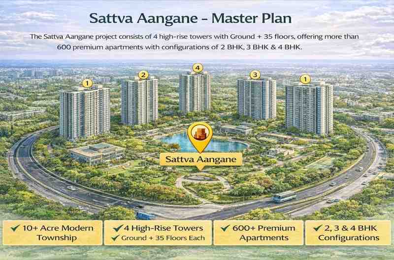 The Sattva Aangane Master Plan showcases a thoughtfully designed residential community developed across 10+ acres of prime land on Old Madras Main Road near Budigere Cross, East Bangalore. The project consists of 4 elegant high-rise towers with G + 35 floors and offers more than 600 premium apartments in 2, 3, and 4 BHK configurations.