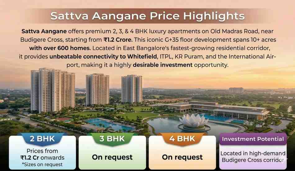 The Sattva Aangane Price is designed to offer excellent value for homebuyers seeking premium apartments in East Bangalore. Located on Old Madras Main Road near Budigere Cross, the project offers spacious 2, 3, and 4 BHK luxury apartments with prices starting from ₹ 1.2 Crore onwards.